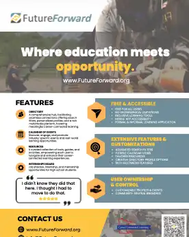 FutureForward™ facilitates connections, promotes industry-specific events, empowers users to enhance their career-connected learning experiences, and hosts a jobs board with opportunities for job shadowing, internships, and mentorships for high school students.