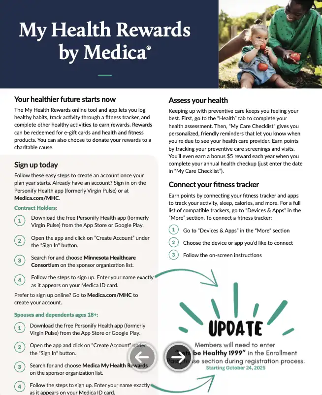 Get started at Medica.com/MyHealthRewards, use Enrollment Passphrase: Let's be Healthy 1999